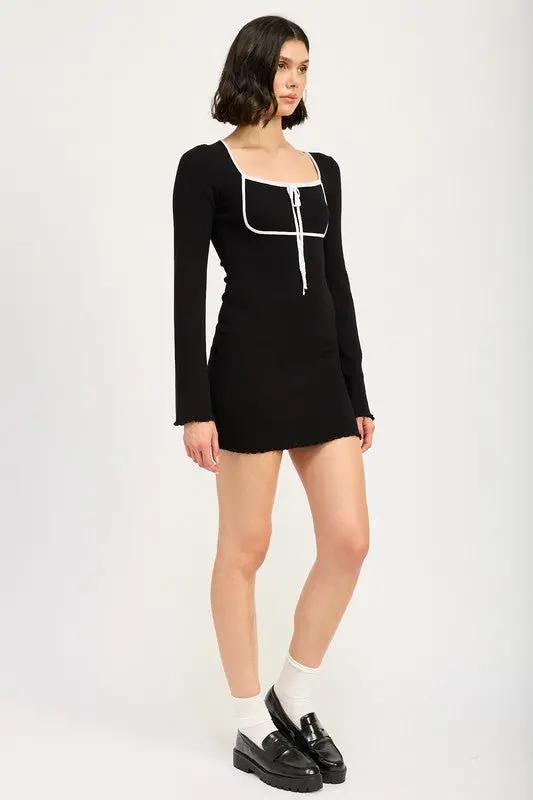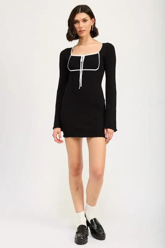 Black long sleeve mini dress with stitching and tie detail on front. Cute, feminine and chic. Dress it up or down.