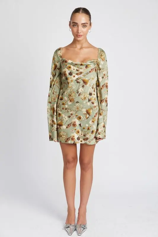 Floral long sleeve mini dress with a beautiful cowl neckline and elastic on shoulders. Relaxed silhouette and satin fabric give off a romantic vibe. From wedding guest to a night out, this dress is as chic as it is flattering.