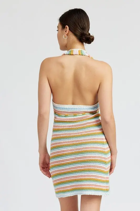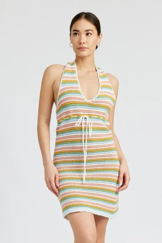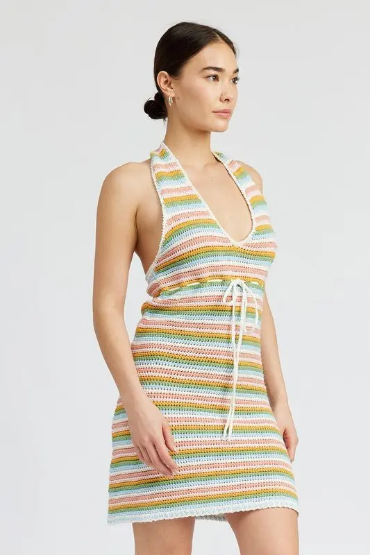 This halter crochet mini dress features a v neckline and tie detail at the waist, providing a flattering fit. Its great stretch ensures a comfortable fit, making it perfect for your next vacation.