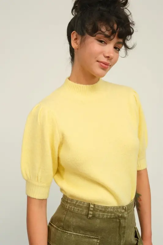 Stay stylishly warm with this knitted sweater. The puffed sleeves and ribbed design add a chic touch, making it a versatile staple in any closet.