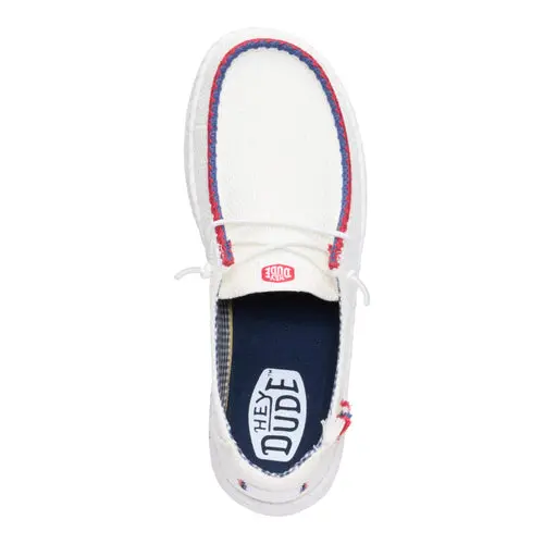 Let freedom ring with the Wendy Espadrille Americana - a cool, festive look that takes on ultra HEYDUDE™ comfort. Designed with a breathable, textile upper, a waffle textured heel with colorful tassels and elastic laces to slip on and off with ease. Finished off with a lightweight, espadrille inspired outsole and plenty of warm weather vibes.